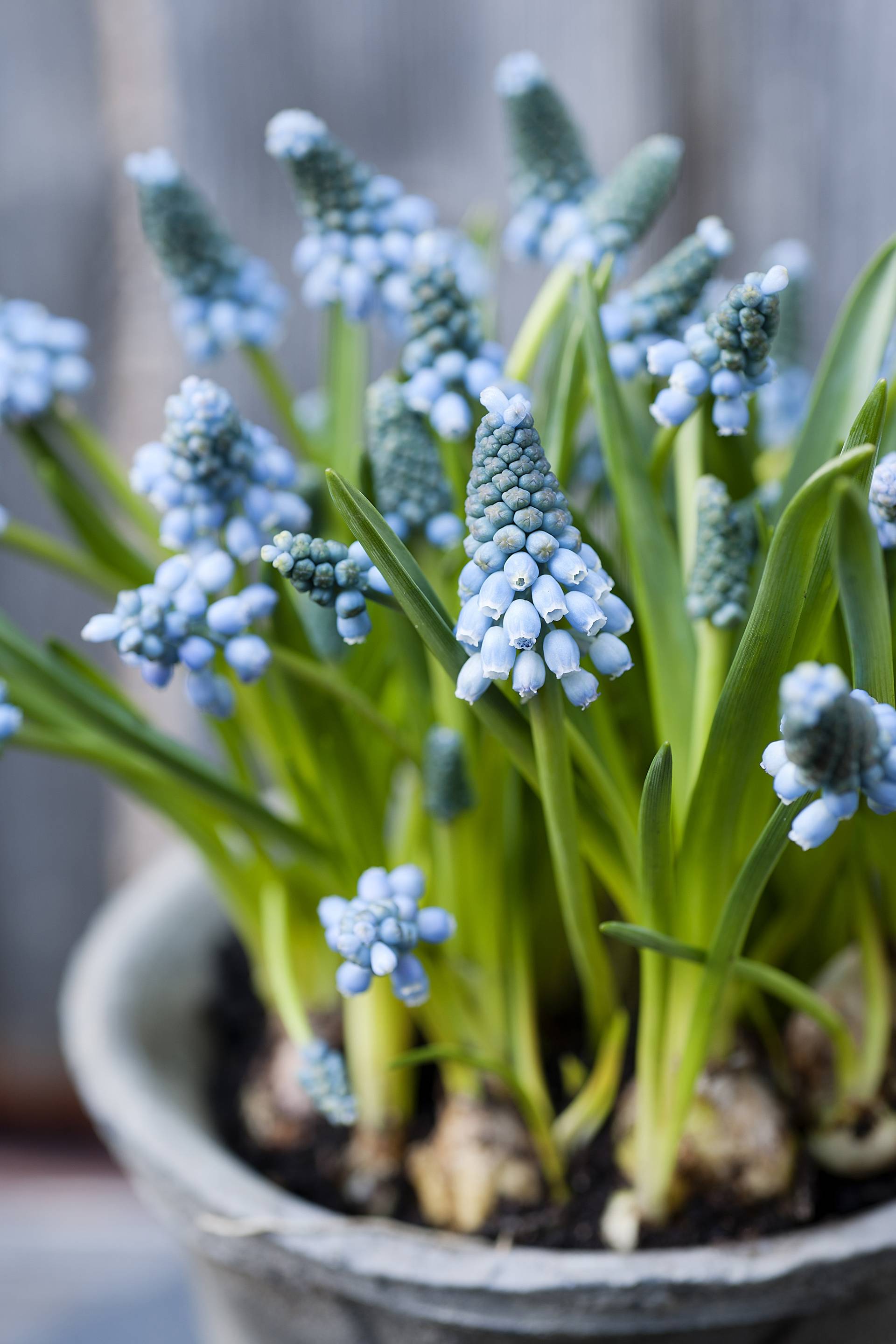 Traubenhyazinthen gibt es in Blau und Weiß. Da diese Zwiebelpflanze im Topf nicht besonders hoch wird, passt die Traubenhyazinthe gut in eine Gruppe aus Zwiebelpflanzen mit langen Stielen wie Amaryllis, Narzissen oder Tulpen.