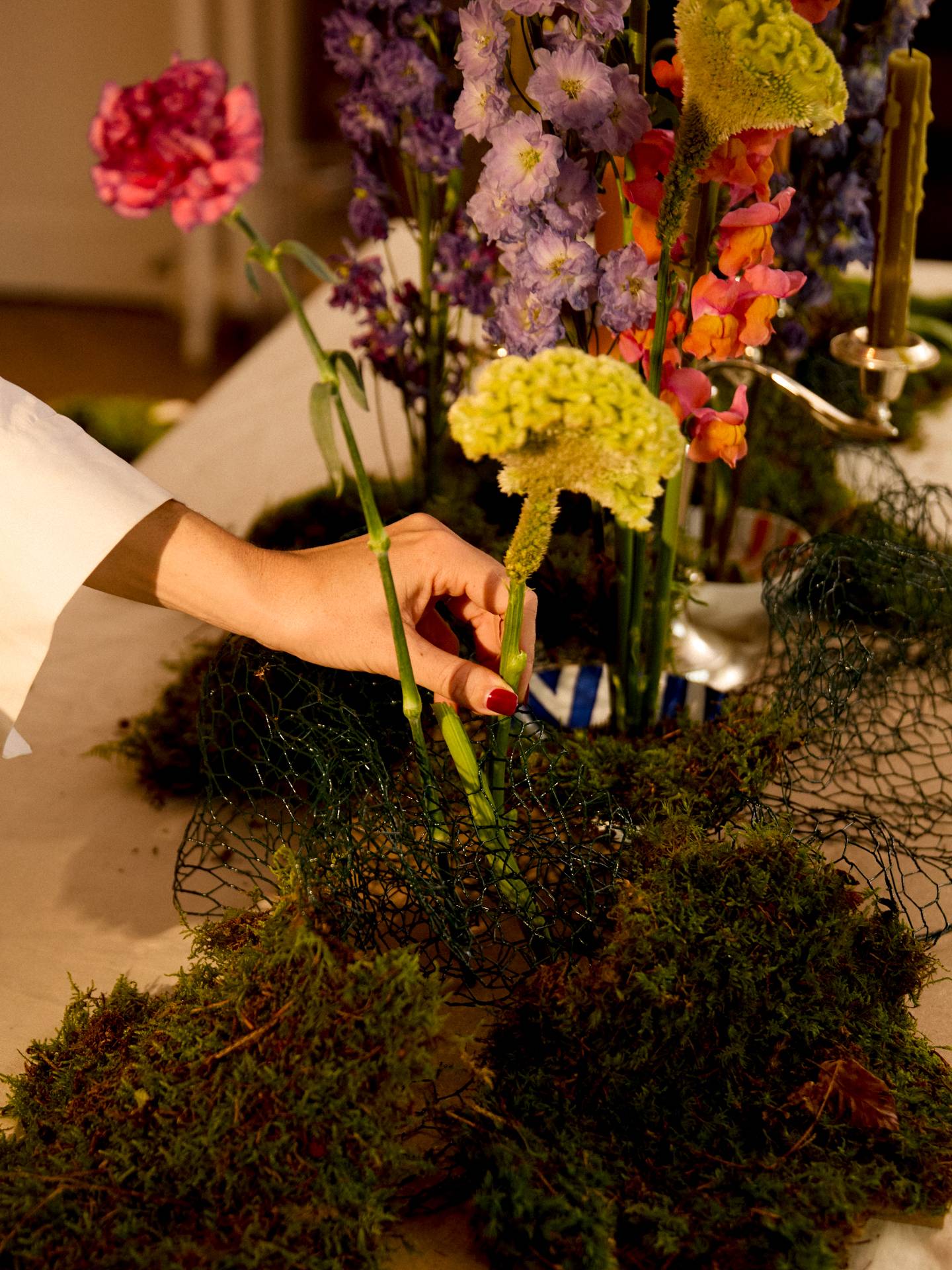 *Pour l’arrangement floral de l'exemple, Pauline a utilisé les fleurs suivantes : tulipe française, gloriosa, kniphofia, aconits, muflier, célosie, œillet, anémone, chrysanthème, renoncule, euphorbe et calla.