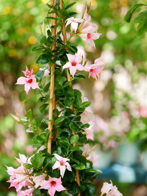 De roze fuchsia, roos en Mandevilla zijn drie alltime favorites wat zachtroze tuinplanten betreft. Ze stralen in potten, maar doen het ook goed in de volle grond.